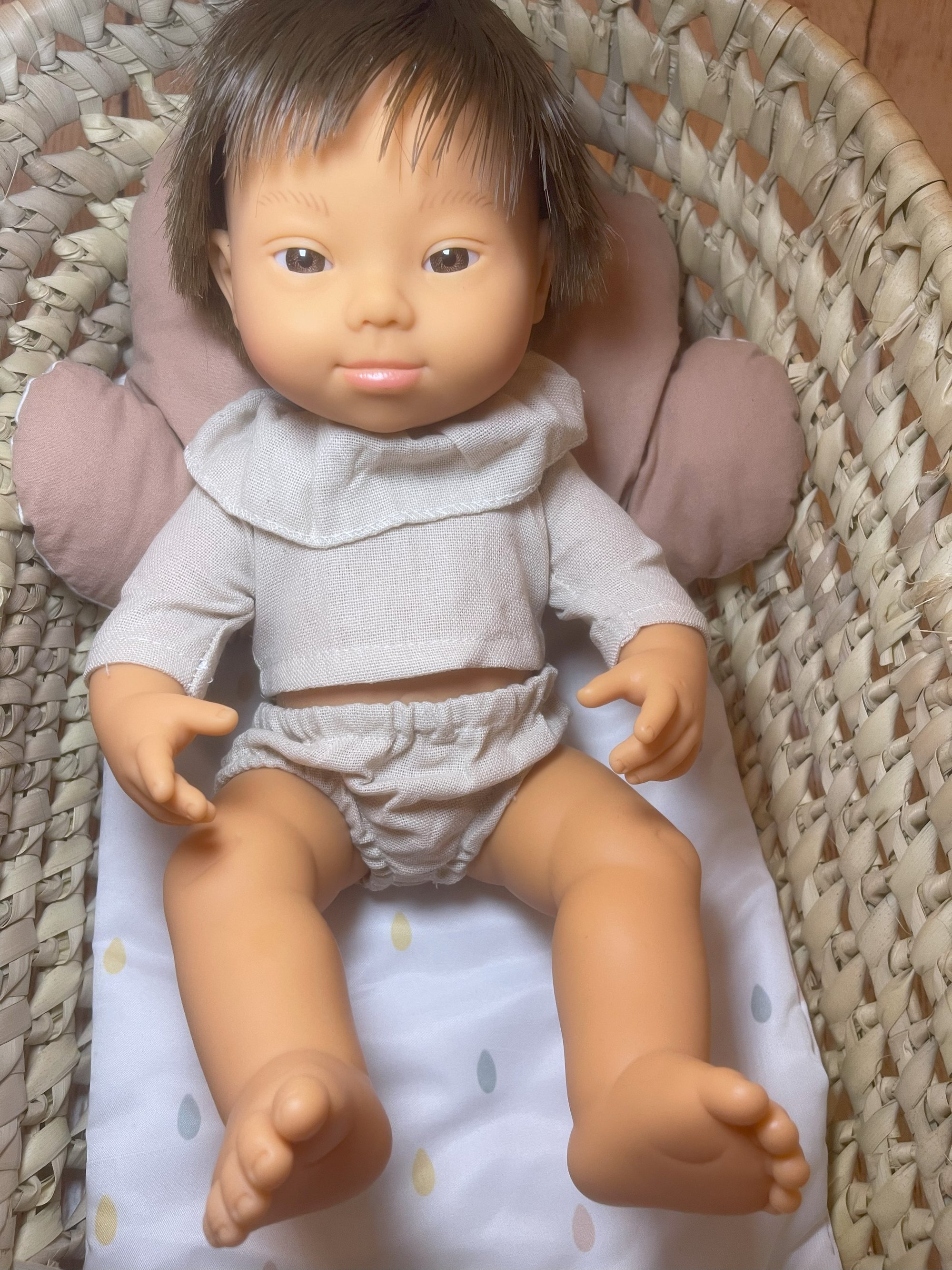 Poupée garçon à la peau blanche et aux cheveux lisses châtains foncés. Il a une délicate odeur de vanille et est sublimé par une "tenue Pierrot".